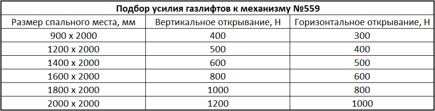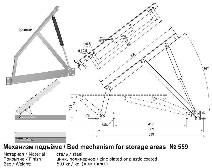 Механизм трансформатор № 559 можно использовать как в мягкой мебели, так и в корпусной. Он служит для подъема ортопедического основания у кроватей, чтобы иметь доступ к бельевому ящику, расположенному под всей плоскостью кровати. Для работы данного механизма, необходимо дополнительно приобрести газлифты (L405мм, ход штока 158мм, d проушины 8мм).