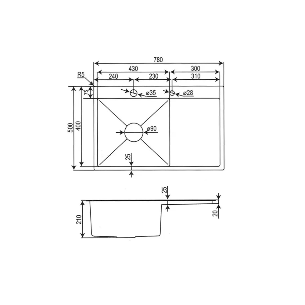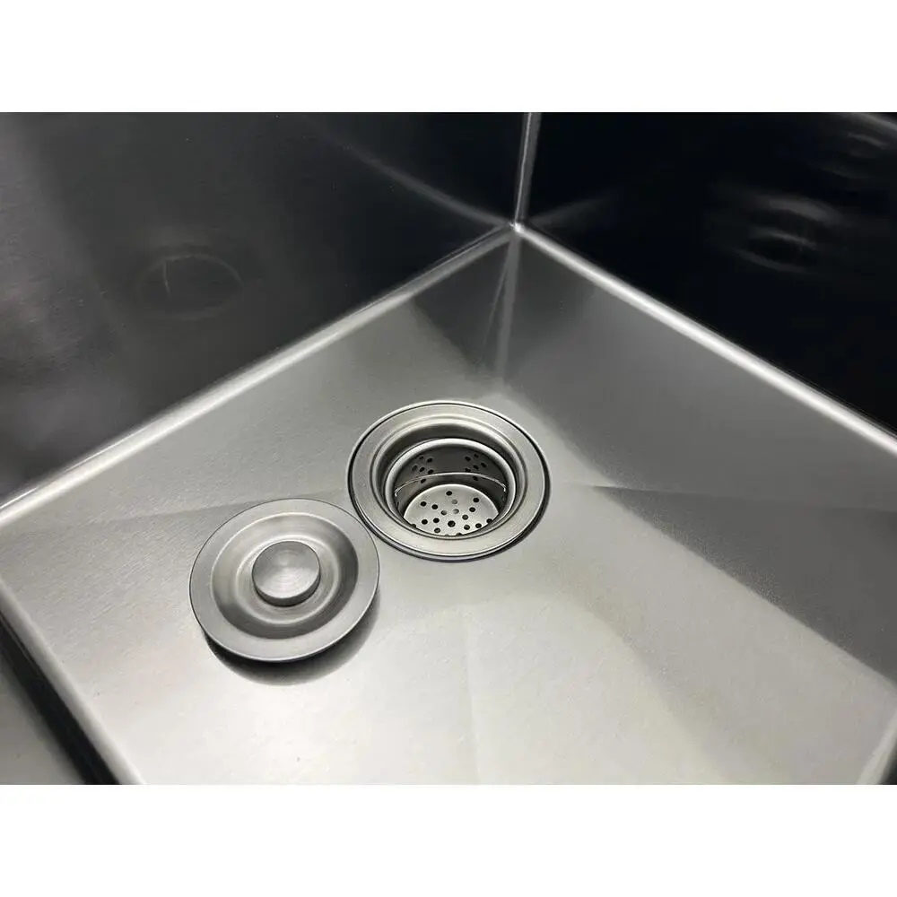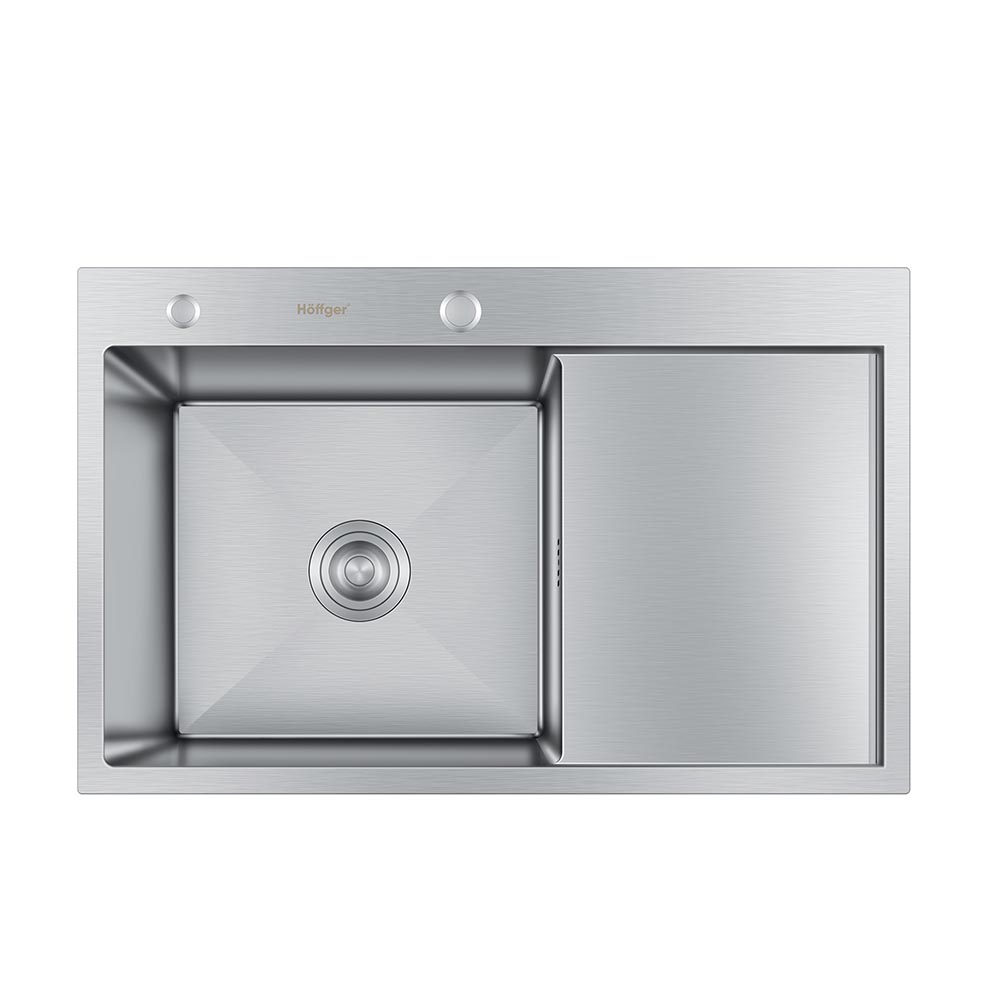 Мойка для кухни HOFFGER 7850 (чаша слева). Многофункциональная кухонная мойка Hoffger HFG-7850 сатин, чаша слева, крыло справа, с двумя отверстиями под смеситель и дозатор. Изготовлена из высококачественной нержавеющей стали AISI304 с PVD покрытием, которое придает изделию особую прочность и коррозионную устойчивость. Толщина борта мойки 3 мм, толщина чаши 1 мм. Мойка имеет закруглённые внутренние углы и дно с небольшим уклоном, чтобы вода не застаивалась в чаше - эти свойства облегчают дальнейший уход за ней. Имеет шумоизолирующее покрытие и накладки с обратной стороны, которые делают мойку тихой при эксплуатации. Монтаж врезной над столешницей, накладная. Устанавливается на силикон или жидкие гвозди, прижимается собственным весом, крепежи в комплект не входят. Уклон дна к выпуску для лучшего водостока. Возможна установка измельчителя пищевых отходов. Шумопоглащающие накладки со всех сторон.