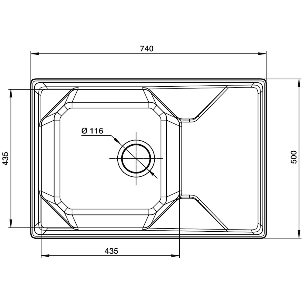 Разрабатывая модель GF - U -740 L , дизайнерское бюро GranFest делало ставку на практичный дизайн удобный в уходе за счет скошенных, не острых углов, и стойкому защитному покрытию ухаживать за такой чашей одно удовольствие. Мойка для кухни подходит как для просторной кухни, так и небольшой и устанавливается в шкаф шириной 500 мм. Хочется обратить внимание на местоположение установки смесителя. Его можно расположить в любой из 4 -х углов.