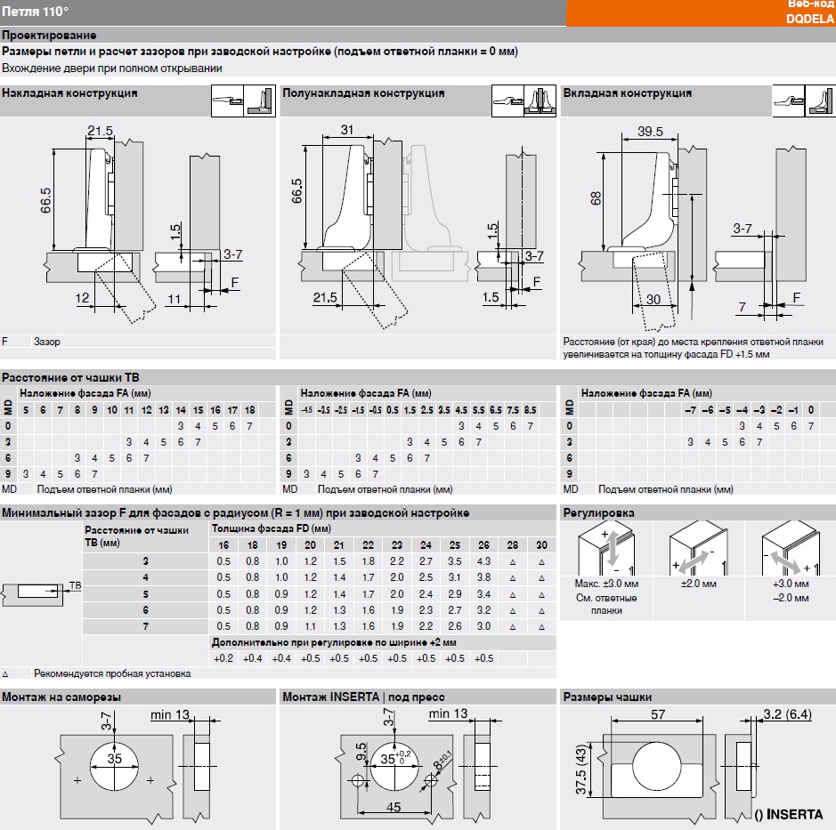 • Стандартный угол открывания: 110°, идеально подходит для большинства типовых дверей.