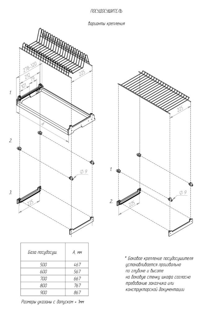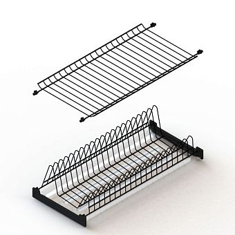 Двухуровневая встраиваемая сушилка для посуды. Предназначена для монтажа в верхний шкафчик кухонного гарнитура. В комплект входят: держатель тарелок и полка для сушки чашек и бокалов, один поддон-накопитель для стекающей воды и крепежные элементы.