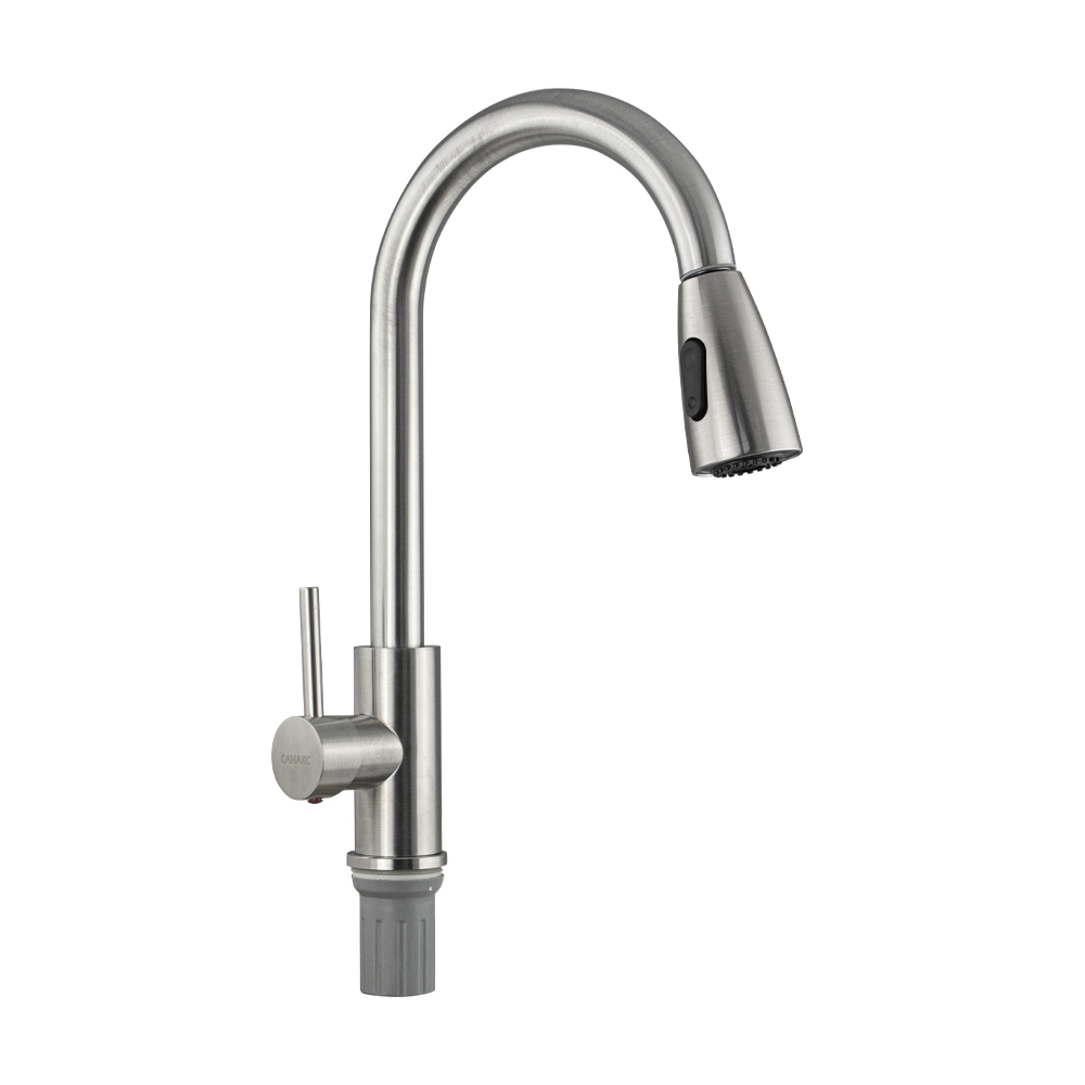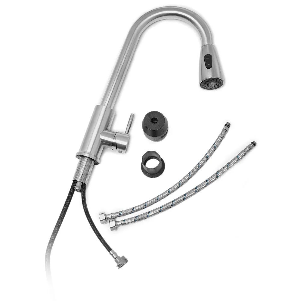 Смеситель для кухонной мойки и раковин, вытяжной излив - лейка с переключением режимов подачи воды, литой матовый корпус, из нержавеющей стали марки SUS 304, шаровый. Крепление резьба - гайка, картридж d = 35 мм, ручка шток. Аэратор для экономии воды. Такая модель может использоваться на домашней кухне, на даче, в медицинских учреждениях и общественных местах. Габаритные размеры: высота мм, длина мм, диаметр посадочного седла мм, длина резьбы мм, длина подводки мм, длина шланга см. Вес - кг, объём - м3. В комплекте паспорт, корпус с изливом, подводка 1/2, крепеж, набор прокладок.