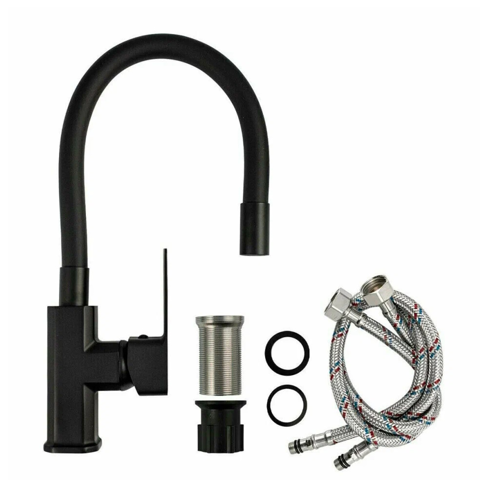 Смеситель для кухонной мойки и раковин, черный, боковой, шаровый, массивный корпус с гибким изливом чёрного цвета, с аэратором для экономии воды. Материал изготовления — ЦАМ (цинк-алюминий-медь). Крепление резьба - гайка, литая ручка. Вес - 1.5 кг, объём - 0.00585 м3. В комплекте корпус с изливом, паспорт, подводка 1/2, крепёж. Габаритные размеры коробки: ширина 200 мм, высота 400 мм, высота резьбы 45 мм, диаметр посадочного седла 45 мм.