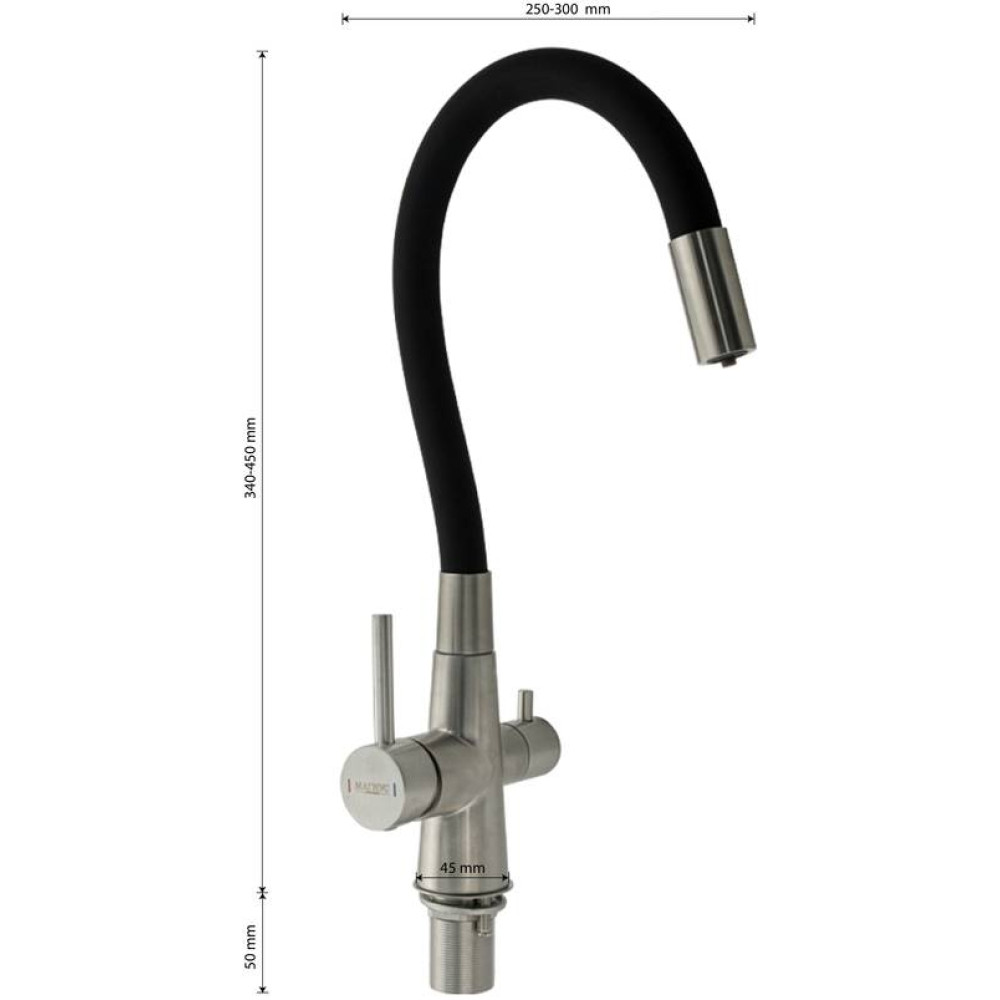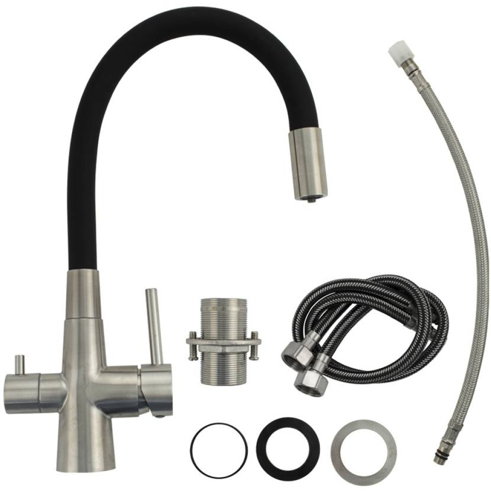 Смеситель для кухонной мойки и раковин с двойным выпуском воды для фильтра, литой матовый корпус, из нержавеющей стали марки 304, с высоким С-образным гибким изливом чёрного цвета, шаровый. Крепление резьба - гайка, картридж d = 40 мм, ручка шток. Аэратор для экономии воды. Такая модель может использоваться на домашней кухне, на даче, в медицинских учреждениях и общественных местах. Габаритные размеры: высота 340 - 450 мм, длина 250 - 300 мм, диаметр посадочного седла 45 мм, длина резьбы 50 мм, длина подводки 450 мм. Вес - 2,450 кг, объём - 0,00700 м3. В комплекте паспорт, корпус с изливом, подводка 1/2, крепеж, набор прокладок.