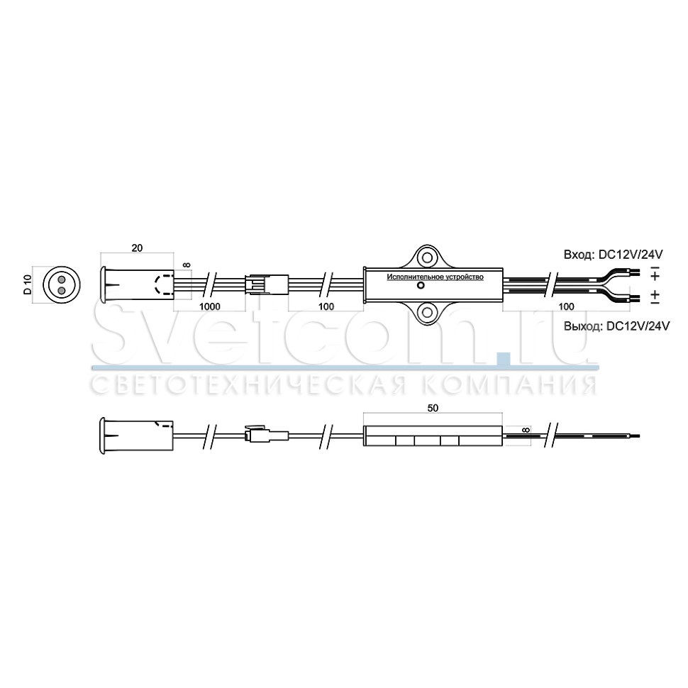 Датчики имеют цилиндрическую форму и внешний диаметр D=10мм, врезное отверстие для установки датчика Dотв = 8мм, но возможен и накладной вариант установки, в комплект выключателя входит аккуратный держатель. Минимальный диаметр датчика допускает установку в полку толщиной от 10 мм и более. Провод от датчика до выключателя L=1м с коннектором. Блок управления 33*50*8,3мм с проводами для питания и нагрузки 2*20AWG L=10см, имеет облуженные концы.