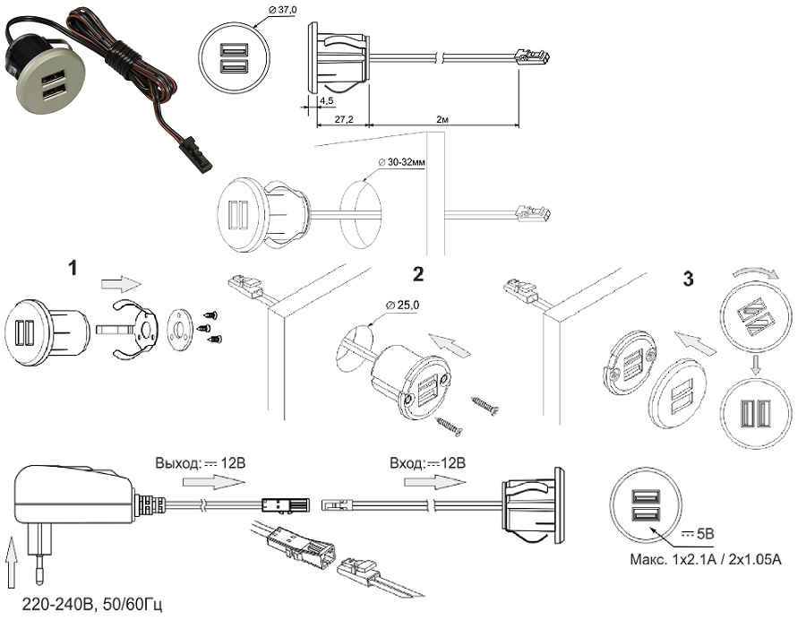 Предлагаемое зарядное устройство CHARGE-S USB имеет компактные размеры, что делает его очень удобным для использования в различных видах корпусной мебели, кухонных гарнитурах, письменных столах и мягкой мебели (как вариант установка в подлокотники).